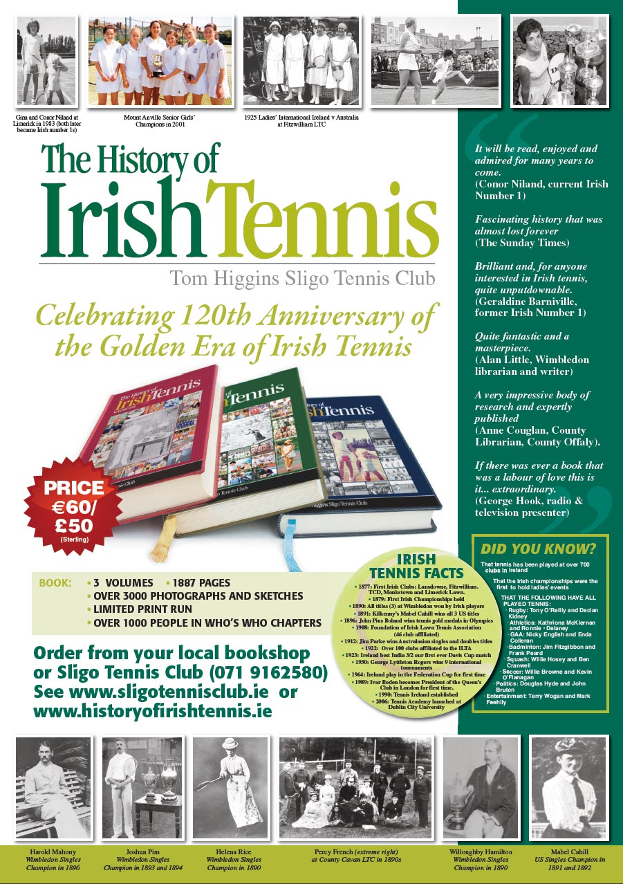 The History of Irish Tennis by Tom Higgins of Sligo Tennis Club, is the most comprehensive and fascinating book ever written on Irish Tennis. It is spread over three volumes and has taken over 7 years to produce.